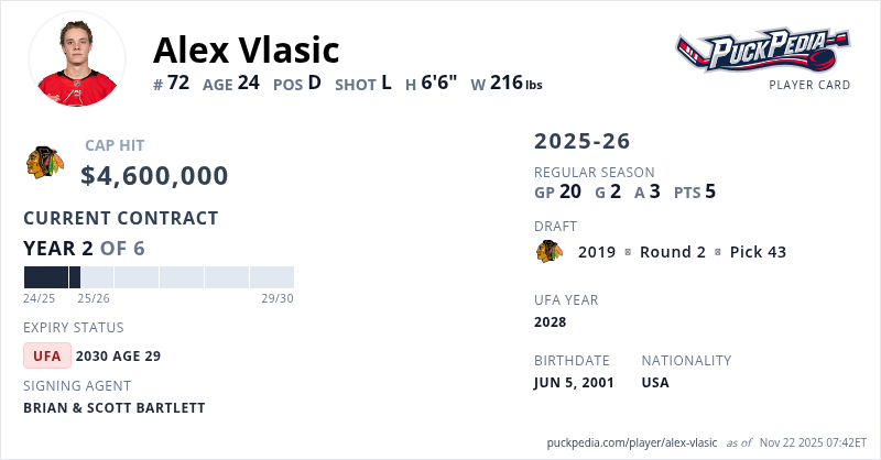 Alex Vlasic is signed to a 6 year, $27,600,000 contract with a cap hit of $4,600,000 per season, playing for the Chicago Blackhawks. His contract expires at the end of the 2029-30 season, making Vlasic an Unrestricted Free Agent.