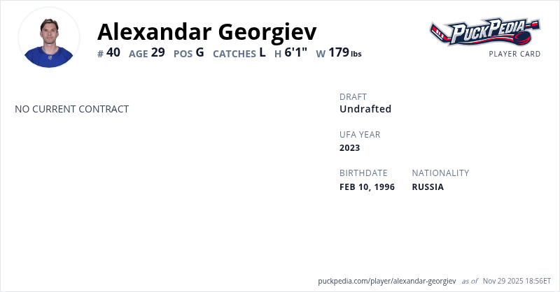Alexandar Georgiev is an Unrestricted Free Agent. His last contract was 1 year, $825,000 with a cap hit of $825,000 per season.