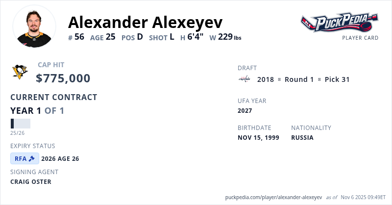 Alexander Alexeyev is signed to a 1 year, $775,000 contract with a cap hit of $775,000 per season, playing for the Pittsburgh Penguins. His contract expires at the end of the 2025-26 season, making Alexeyev a Restricted Free Agent.