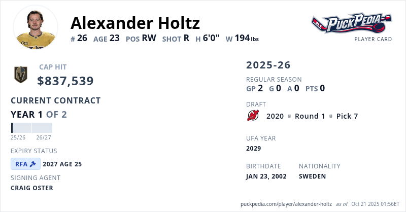 Alexander Holtz is signed to a 2 year, $1,675,077 contract with a cap hit of $837,539 per season, playing for the Vegas Golden Knights. His contract expires at the end of the 2026-27 season, making Holtz a Restricted Free Agent.