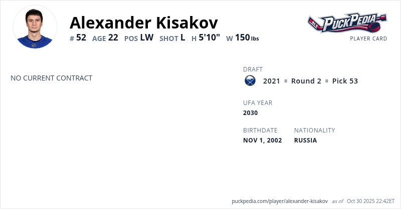 Alexander Kisakov is an Unrestricted Free Agent (No Qualifying Offer). His last contract was 3 years, $2,577,501 with a cap hit of $859,167 per season. It expired at the end of the 2024-25 season.