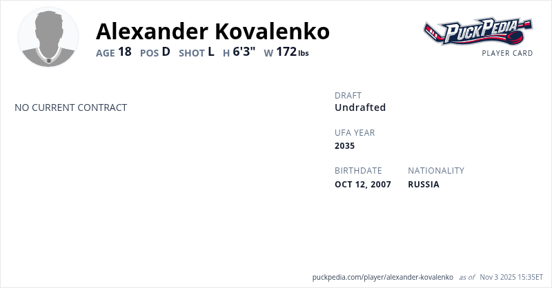 | 2025-26 | 18 | MHL | Belye Medvedi Chelyabinsk | 16 | 1 | 6 | 7 | 4 | ||||||||||||||||||||||
