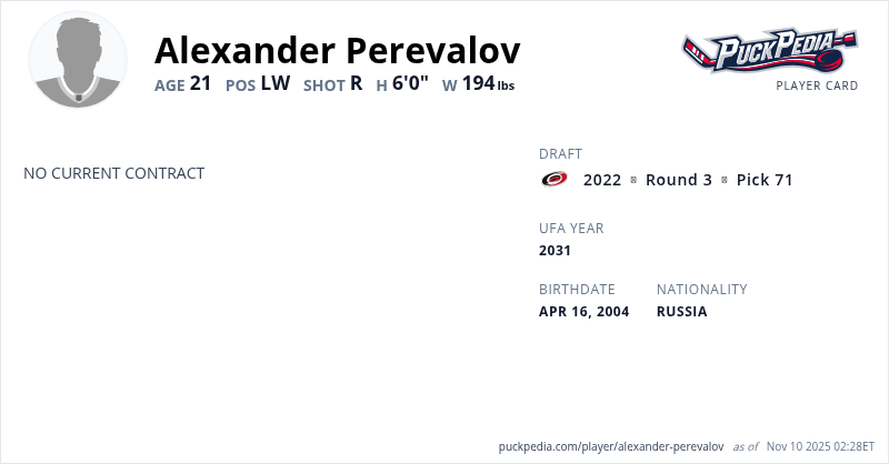Perevalov was selected 71st overall by the Carolina Hurricanes in the 2022 NHL Entry Draft on Friday.