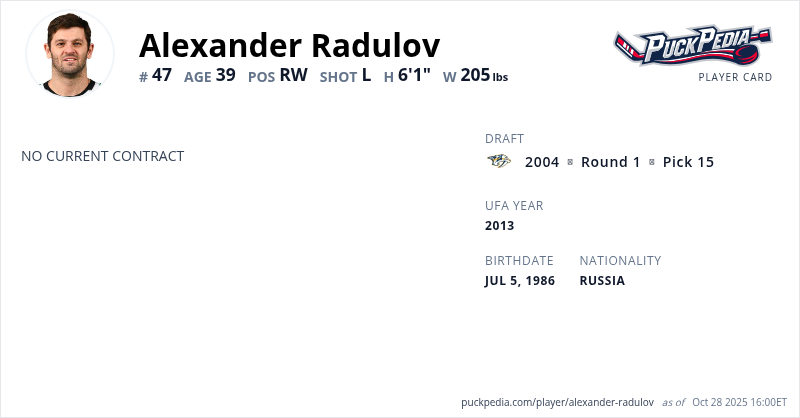 Alexander Radulov is an Unrestricted Free Agent. His last contract was 5 years, $31,250,000 with a cap hit of $6,250,000 per season. It expired at the end of the 2021-22 season.