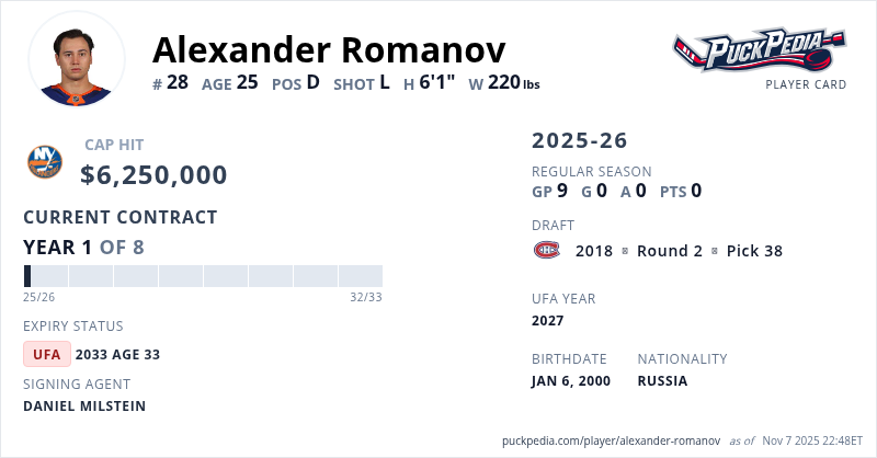 Alexander Romanov is signed to a 8 year, $50,000,000 contract with a cap hit of $6,250,000 per season, playing for the New York Islanders. His contract expires at the end of the 2032-33 season, making Romanov an Unrestricted Free Agent.