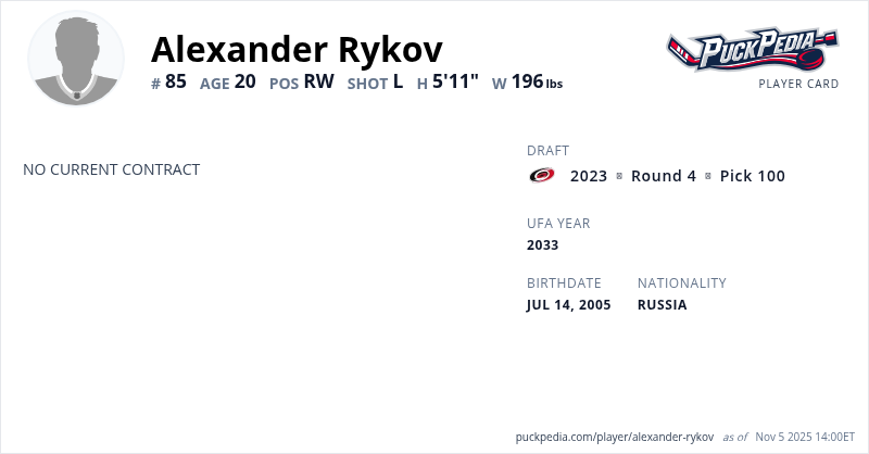 Rykov was selected 100th overall by the Carolina Hurricanes in the 2023 NHL Entry Draft on Thursday.