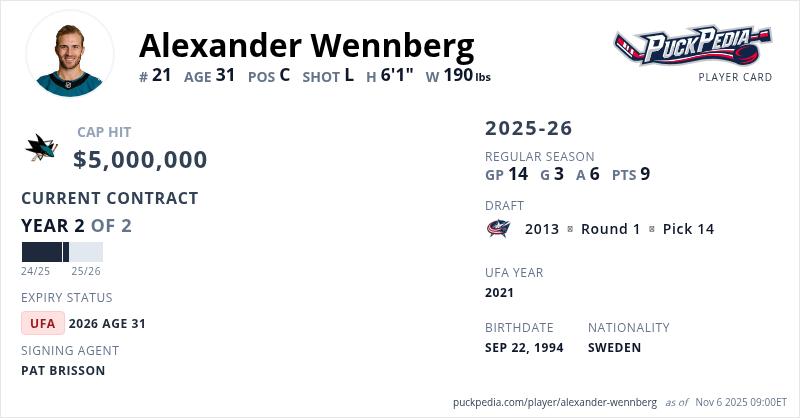 Alexander Wennberg is signed to a 2 year, $10,000,000 contract with a cap hit of $5,000,000 per season, playing for the San Jose Sharks. His contract expires at the end of the 2025-26 season, making Wennberg an Unrestricted Free Agent.