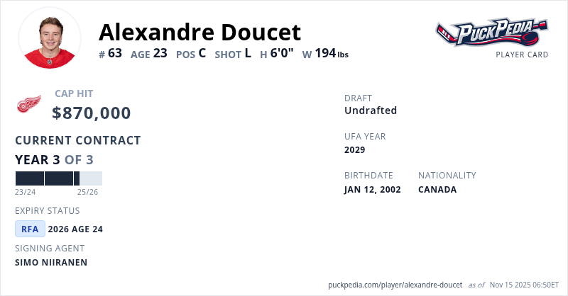 Alexandre Doucet is signed to a 3 year, $2,610,000 contract with a cap hit of $870,000 per season, playing for the Detroit Red Wings. His contract expires at the end of the 2025-26 season, making Doucet a Restricted Free Agent.