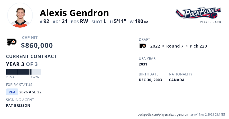Alexis Gendron is signed to a 3 year, $2,580,000 contract with a cap hit of $860,000 per season, playing for the Philadelphia Flyers. His contract expires at the end of the 2025-26 season, making Gendron a Restricted Free Agent.