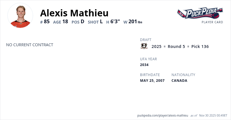 | 2024-25 | 17 | QMJHL | Baie-Comeau Drakkar | 59 | 3 | 3 | 6 | 88 | Playoffs | 11 | 0 | 3 | 3 | 0 | ||||||||||||||||