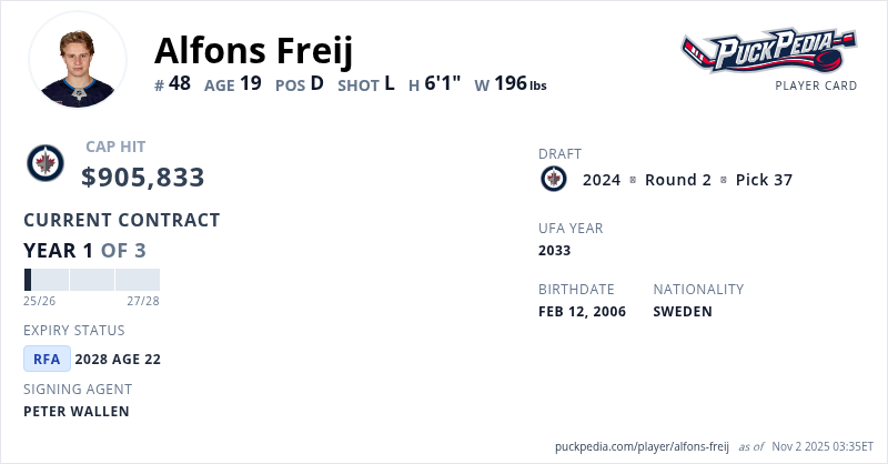 Alfons Freij is signed to a 3 year, $2,717,499 contract with a cap hit of $905,833 per season, playing for the Winnipeg Jets. His contract expires at the end of the 2027-28 season, making Freij a Restricted Free Agent.