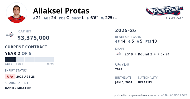 Aliaksei Protas is signed to a 5 year, $16,875,000 contract with a cap hit of $3,375,000 per season, playing for the Washington Capitals. His contract expires at the end of the 2028-29 season, making Protas an Unrestricted Free Agent.