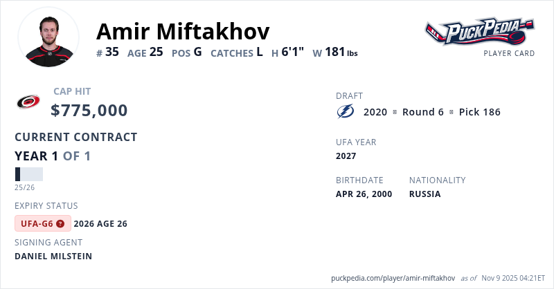 Amir Miftakhov is signed to a 1 year, $775,000 contract with a cap hit of $775,000 per season, playing for the Carolina Hurricanes. His contract expires at the end of the 2025-26 season, making Miftakhov an Unrestricted Free Agent (Group 6).