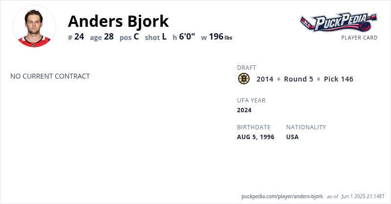 Anders Bjork is an Unrestricted Free Agent (No Qualifying Offer). His last contract was 3 years, $4,800,000 with a cap hit of $1,600,000 per season. It expired at the end of the 2022-23 season.