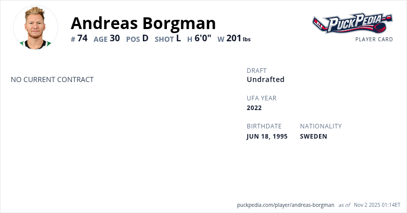 Andreas Borgman is an Unrestricted Free Agent. His last contract was 1 year, $750,000 with a cap hit of $750,000 per season. It expired at the end of the 2021-22 season.