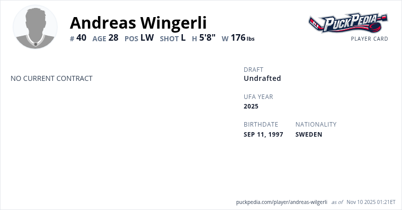 Andreas Wingerli is an Unrestricted Free Agent (No Qualifying Offer). His last contract was 1 year, $842,500 with a cap hit of $842,500 per season. It expired at the end of the 2021-22 season.