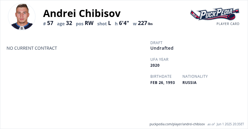 Andrei Chibisov is an Unrestricted Free Agent. His last contract was 1 year, $792,500 with a cap hit of $792,500 per season. It expired at the end of the 2019-20 season.