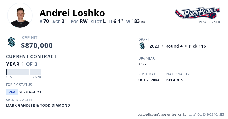 Andrei Loshko is signed to a 3 year, $2,610,000 contract with a cap hit of $870,000 per season, playing for the Seattle Kraken. His contract expires at the end of the 2027-28 season, making Loshko a Restricted Free Agent.
