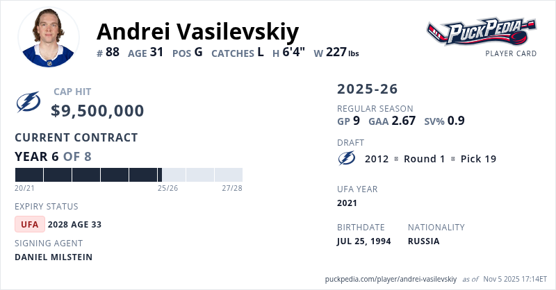 Andrei Vasilevskiy is signed to a 8 year, $76,000,000 contract with a cap hit of $9,500,000 per season, playing for the Tampa Bay Lightning. His contract expires at the end of the 2027-28 season, making Vasilevskiy an Unrestricted Free Agent.