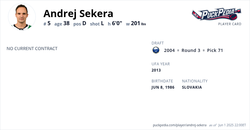 Andrej Sekera is an Unrestricted Free Agent. His last contract was 2 years, $3,000,000 with a cap hit of $1,500,000 per season. It expired at the end of the 2021-22 season.