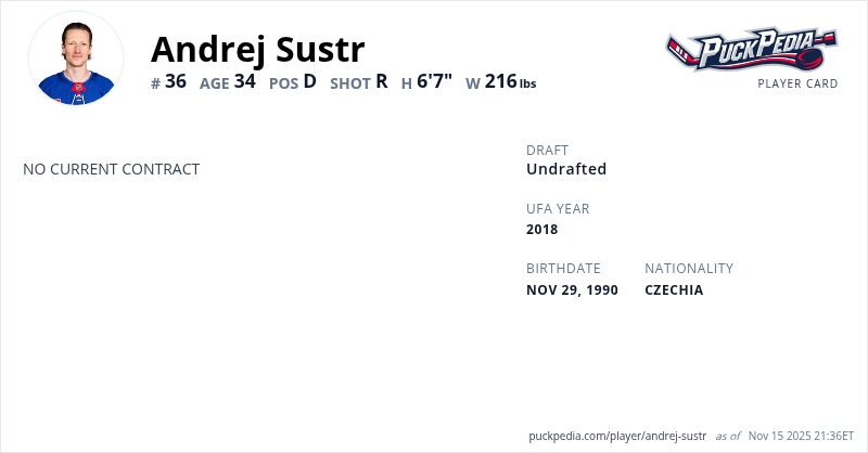 Andrej Sustr is an Unrestricted Free Agent. His last contract was 1 year, $750,000 with a cap hit of $750,000 per season. It expired at the end of the 2022-23 season.