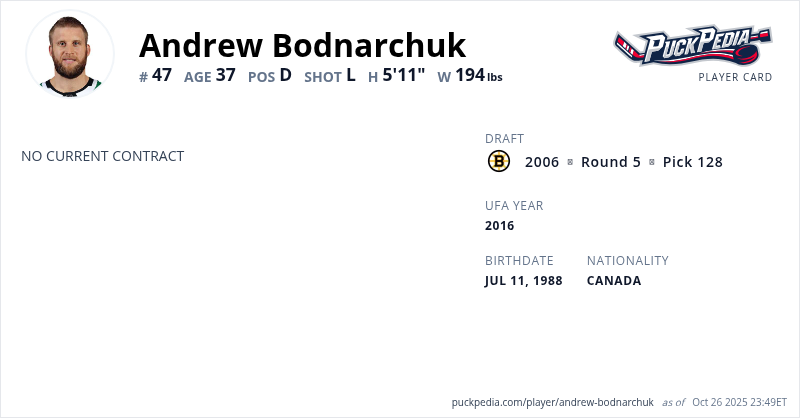 Andrew Bodnarchuk is an Unrestricted Free Agent. His last contract was 2 years, $1,450,000 with a cap hit of $725,000 per season. It expired at the end of the 2017-18 season.