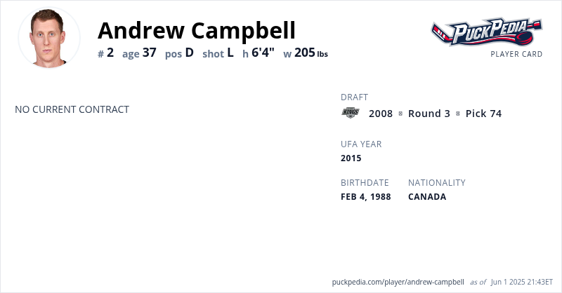 Andrew Campbell is an Unrestricted Free Agent. His last contract was 2 years, $1,300,000 with a cap hit of $650,000 per season. It expired at the end of the 2018-19 season.