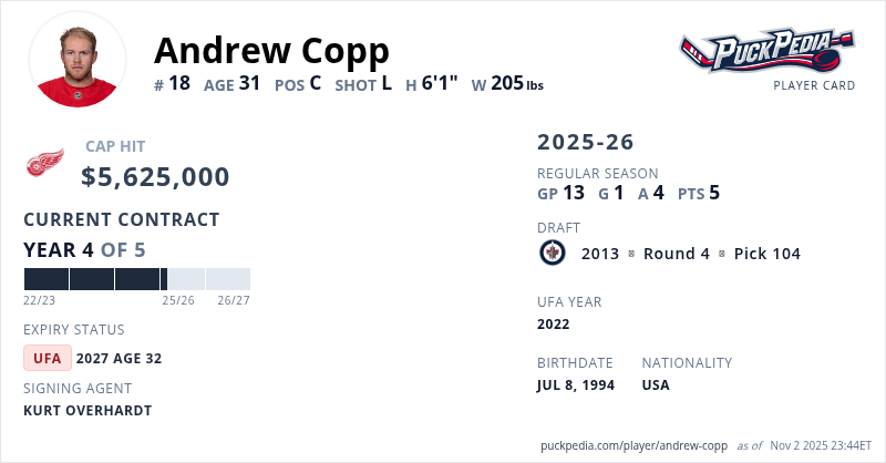 Andrew Copp is signed to a 5 year, $28,125,000 contract with a cap hit of $5,625,000 per season, playing for the Detroit Red Wings. His contract expires at the end of the 2026-27 season, making Copp an Unrestricted Free Agent.