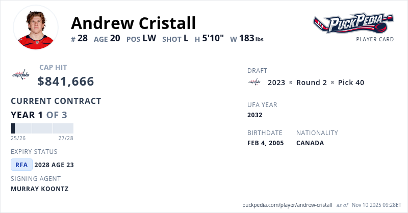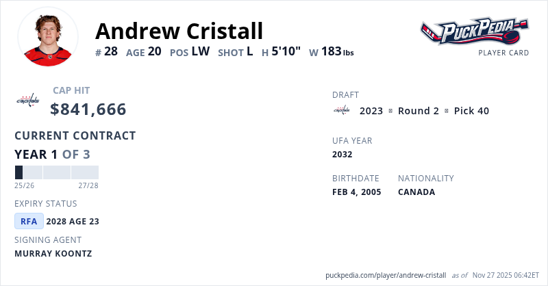 Andrew Cristall is signed to a 3 year, $2,524,998 contract with a cap hit of $841,666 per season, playing for the Washington Capitals. His contract expires at the end of the 2027-28 season, making Cristall a Restricted Free Agent.