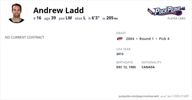 Andrew Ladd is an Unrestricted Free Agent. His last contract was 7 years, $38,500,000 with a cap hit of $5,500,000 per season. It expired at the end of the 2022-23 season.