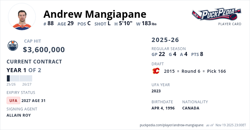 Andrew Mangiapane is signed to a 2 year, $7,200,000 contract with a cap hit of $3,600,000 per season, playing for the Edmonton Oilers. His contract expires at the end of the 2026-27 season, making Mangiapane an Unrestricted Free Agent.