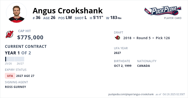 Angus Crookshank is signed to a 2 year, $1,550,000 contract with a cap hit of $775,000 per season, playing for the New Jersey Devils. His contract expires at the end of the 2026-27 season, making Crookshank an Unrestricted Free Agent.