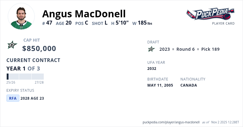 Angus MacDonell is signed to a 3 year, $2,550,000 contract with a cap hit of $850,000 per season, playing for the Dallas Stars. His contract expires at the end of the 2027-28 season, making MacDonell a Restricted Free Agent.