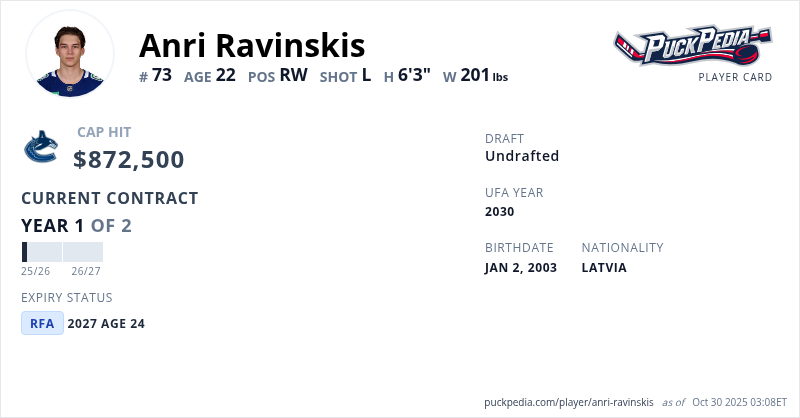 Anri Ravinskis is signed to a 2 year, $1,745,000 contract with a cap hit of $872,500 per season, playing for the Vancouver Canucks. His contract expires at the end of the 2026-27 season, making Ravinskis a Restricted Free Agent.