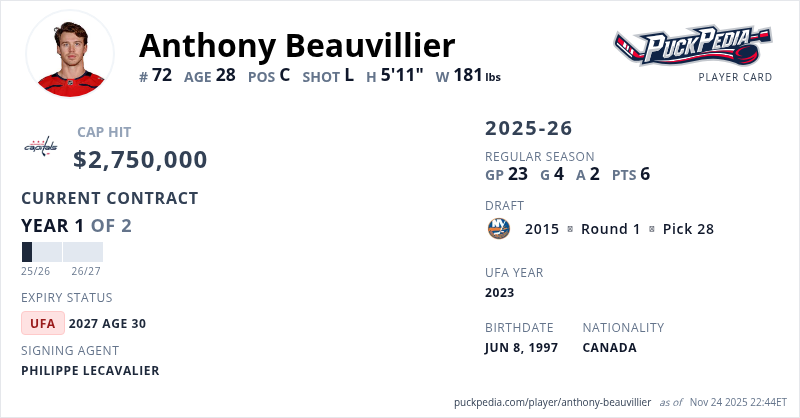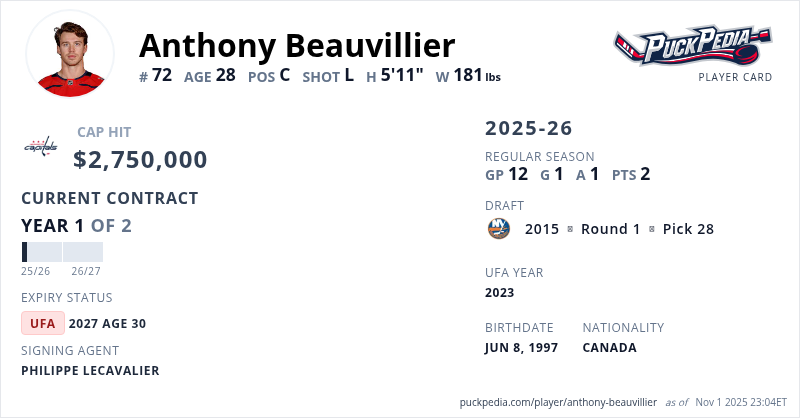 Anthony Beauvillier is signed to a 2 year, $5,500,000 contract with a cap hit of $2,750,000 per season, playing for the Washington Capitals. His contract expires at the end of the 2026-27 season, making Beauvillier an Unrestricted Free Agent.