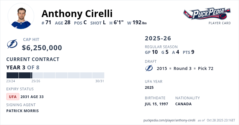 Anthony Cirelli is signed to a 8 year, $50,000,000 contract with a cap hit of $6,250,000 per season, playing for the Tampa Bay Lightning. His contract expires at the end of the 2030-31 season, making Cirelli an Unrestricted Free Agent.