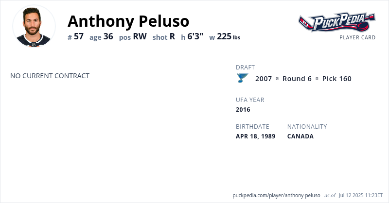 Anthony Peluso is an Unrestricted Free Agent. His last contract was 1 year, $650,000 with a cap hit of $650,000 per season. It expired at the end of the 2018-19 season.