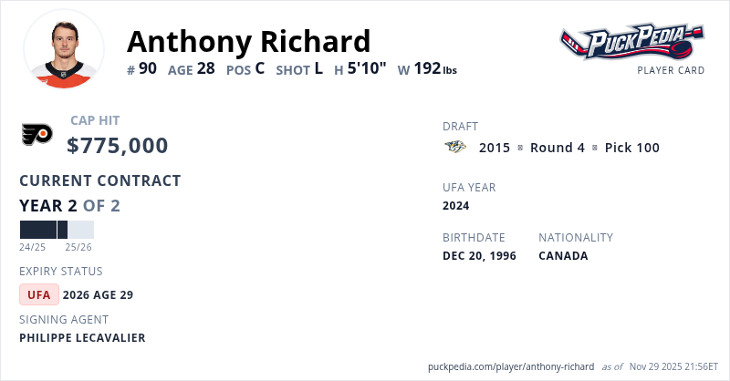 Anthony Richard is signed to a 2 year, $1,550,000 contract with a cap hit of $775,000 per season, playing for the Philadelphia Flyers. His contract expires at the end of the 2025-26 season, making Richard an Unrestricted Free Agent.