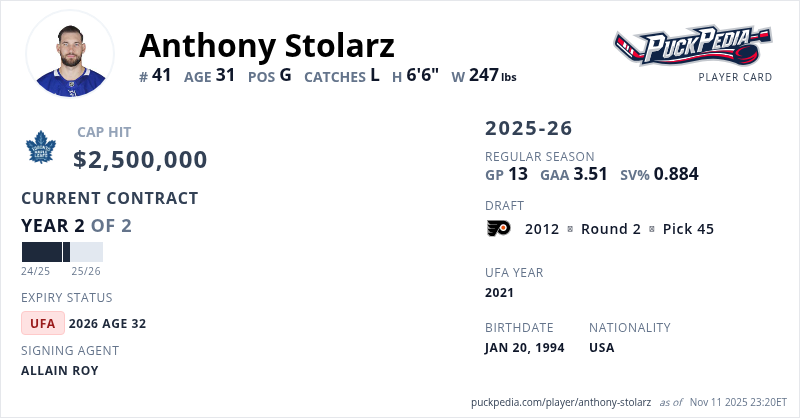 Anthony Stolarz is signed to a 4 year, $15,000,000 contract extension with a cap hit of $3,750,000 per season. He plays for the Toronto Maple Leafs. His next contract begins for the 2026-27 season and expires at the end of the 2029-30 season, making him an Unrestricted Free Agent.