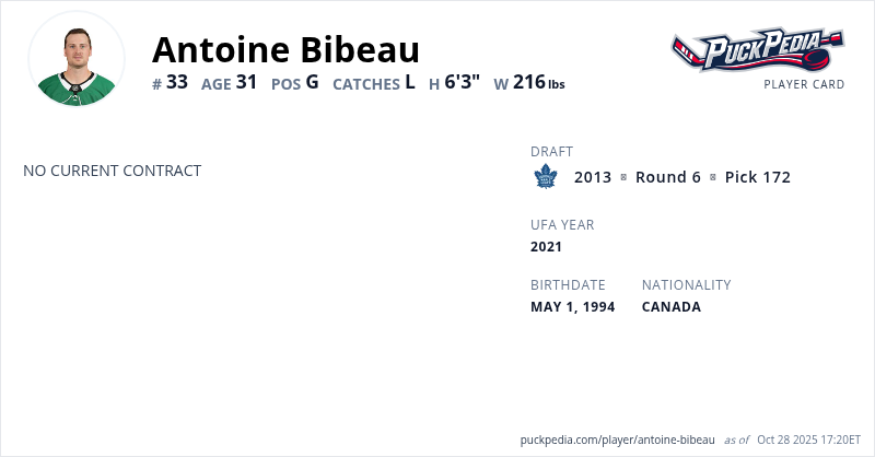 Antoine Bibeau is an Unrestricted Free Agent. His last contract was 1 year, $750,000 with a cap hit of $750,000 per season. It expired at the end of the 2022-23 season.