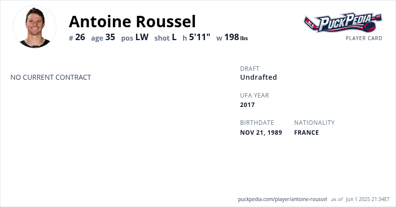 Antoine Roussel is an Unrestricted Free Agent. His last contract was 4 years, $12,000,000 with a cap hit of $3,000,000 per season. It expired at the end of the 2021-22 season.
