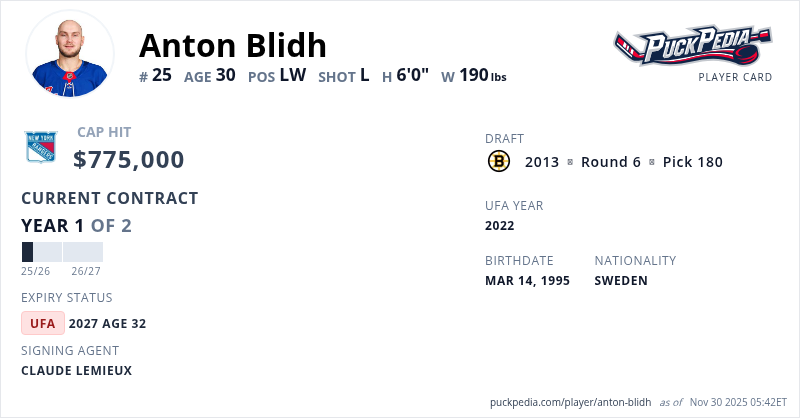 Anton Blidh is signed to a 2 year, $1,550,000 contract with a cap hit of $775,000 per season, playing for the New York Rangers. His contract expires at the end of the 2026-27 season, making Blidh an Unrestricted Free Agent.