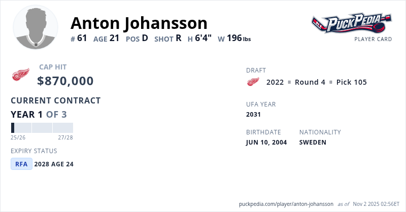 Anton Johansson is signed to a 3 year, $2,610,000 contract with a cap hit of $870,000 per season, playing for the Detroit Red Wings. His contract expires at the end of the 2027-28 season, making Johansson a Restricted Free Agent.