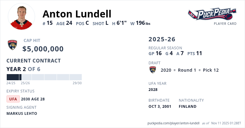Anton Lundell is signed to a 6 year, $30,000,000 contract with a cap hit of $5,000,000 per season, playing for the Florida Panthers. His contract expires at the end of the 2029-30 season, making Lundell an Unrestricted Free Agent.