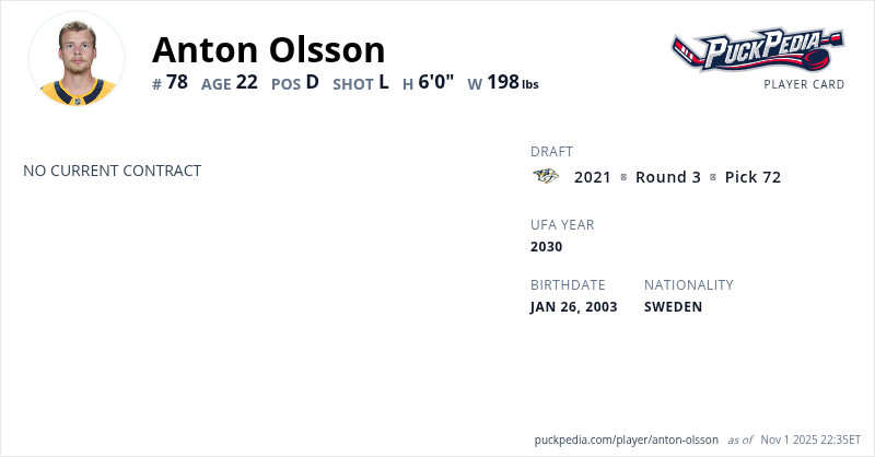Olsson was drafted 72nd overall by the Nashville Predators at the 2021 NHL Draft on Saturday.