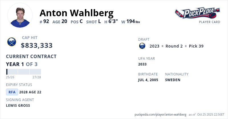 Anton Wahlberg is signed to a 3 year, $2,499,999 contract with a cap hit of $833,333 per season, playing for the Buffalo Sabres. His contract expires at the end of the 2027-28 season, making Wahlberg a Restricted Free Agent.