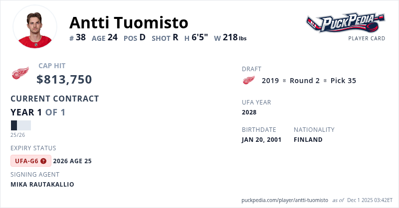 Antti Tuomisto is signed to a 1 year, $813,750 contract with a cap hit of $813,750 per season, playing for the Detroit Red Wings. His contract expires at the end of the 2025-26 season, making Tuomisto an Unrestricted Free Agent (Group 6).