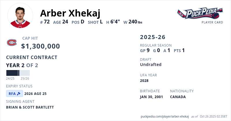 Arber Xhekaj is signed to a 2 year, $2,600,000 contract with a cap hit of $1,300,000 per season, playing for the Montreal Canadiens. His contract expires at the end of the 2025-26 season, making Xhekaj a Restricted Free Agent.