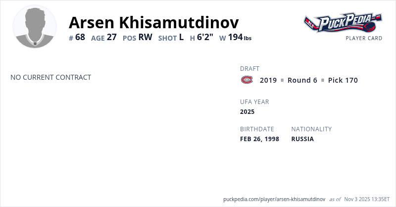 Arsen Khisamutdinov is a Restricted Free Agent. His last contract was 2 years, $1,590,000 with a cap hit of $795,000 per season. It expired at the end of the 2021-22 season.