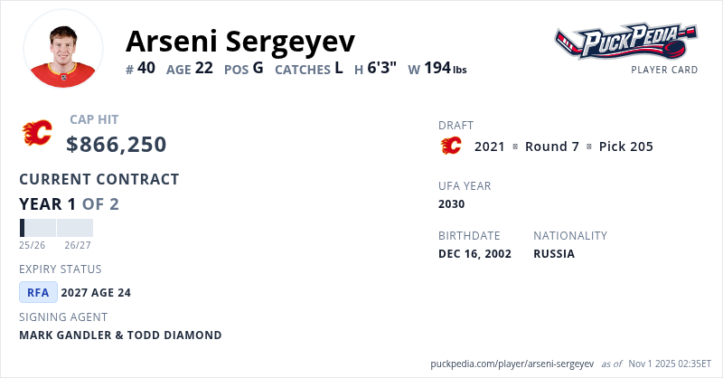 Arseni Sergeyev is signed to a 2 year, $1,732,500 contract with a cap hit of $866,250 per season, playing for the Calgary Flames. His contract expires at the end of the 2026-27 season, making Sergeyev a Restricted Free Agent.
